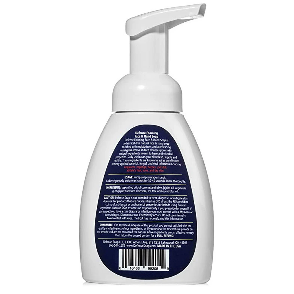 Defense original foaming face and hand soap is organic and both vegan and Non-GMO. The rich, foam lather promotes thorough washing and rinses clean for naturally soothed and refreshed skin. The natural tea tree and eucalyptus oil that we use in our foaming soaps provide a spectrum of antimicrobial benefits and promote healthy skin. Our foaming soaps never contain any parabens, sulfates, SLS, triclosan, or fragrances. We also offer a foaming hand soap refill that will fill up your original bottle up to four times. This product is made in the USA.