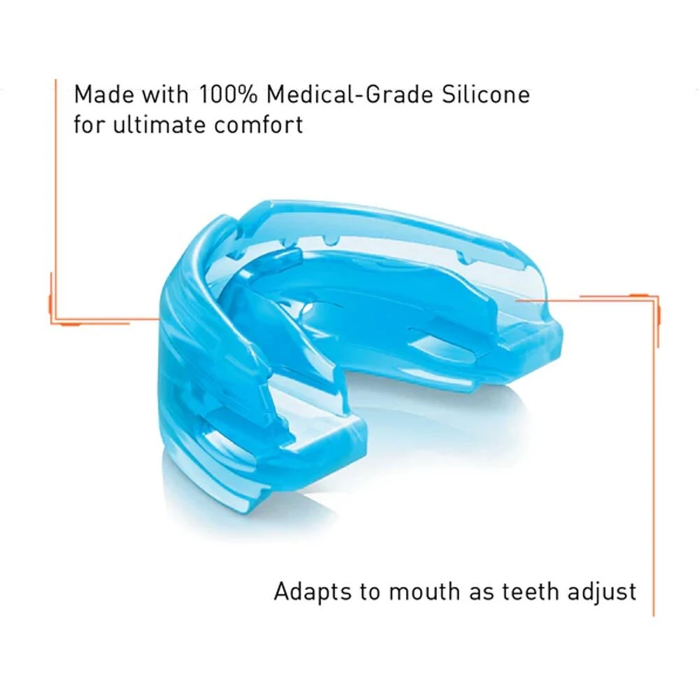 The Braces Mouthguard, offering essential protection for youth and adult athletes with braces, is specifically designed to conform to upper brace brackets for instant comfort and prevention from lacerations. Made with 100% medical-grade silicone, it adapts to changes in mouth structure as teeth adjust. Available in strapped or strapless versions.