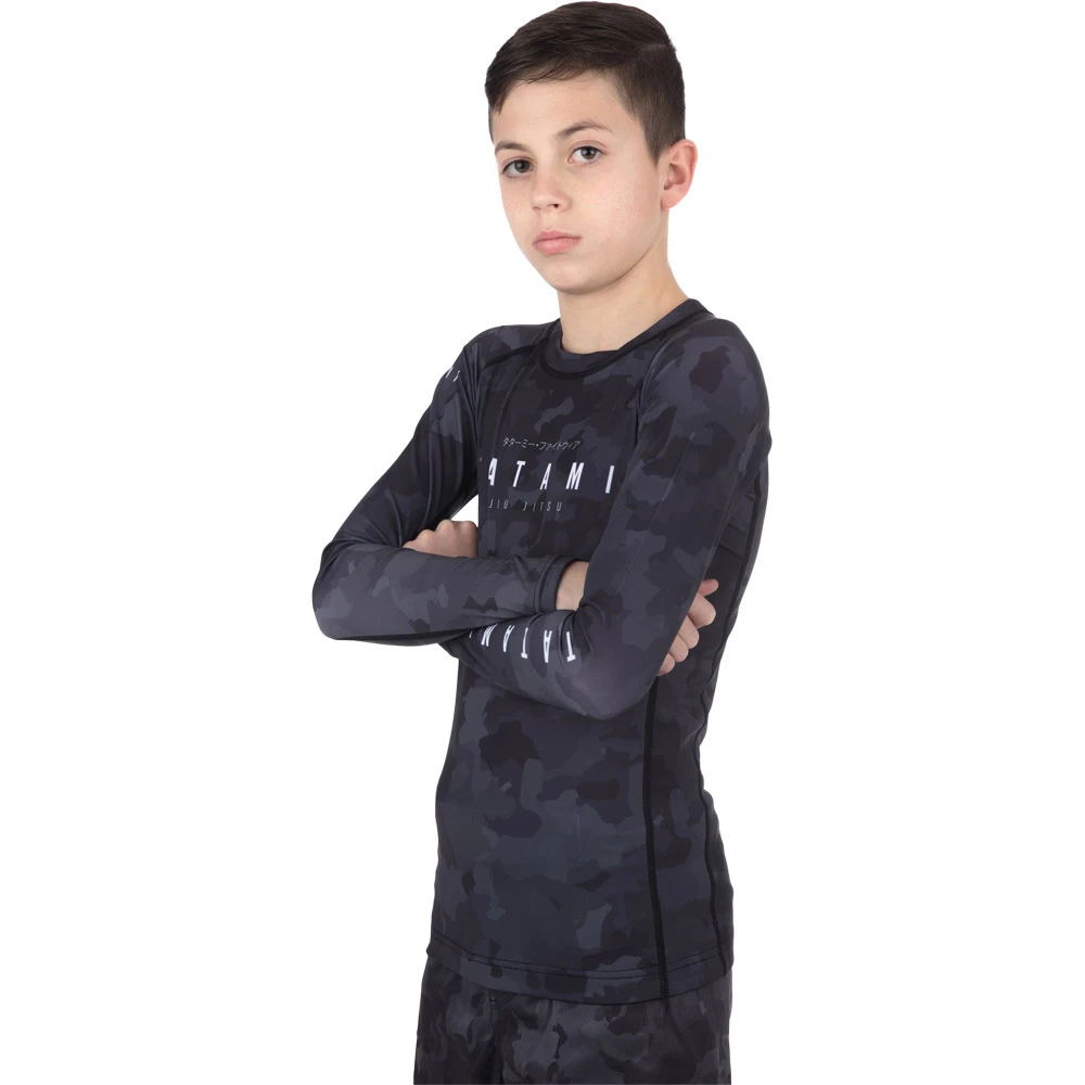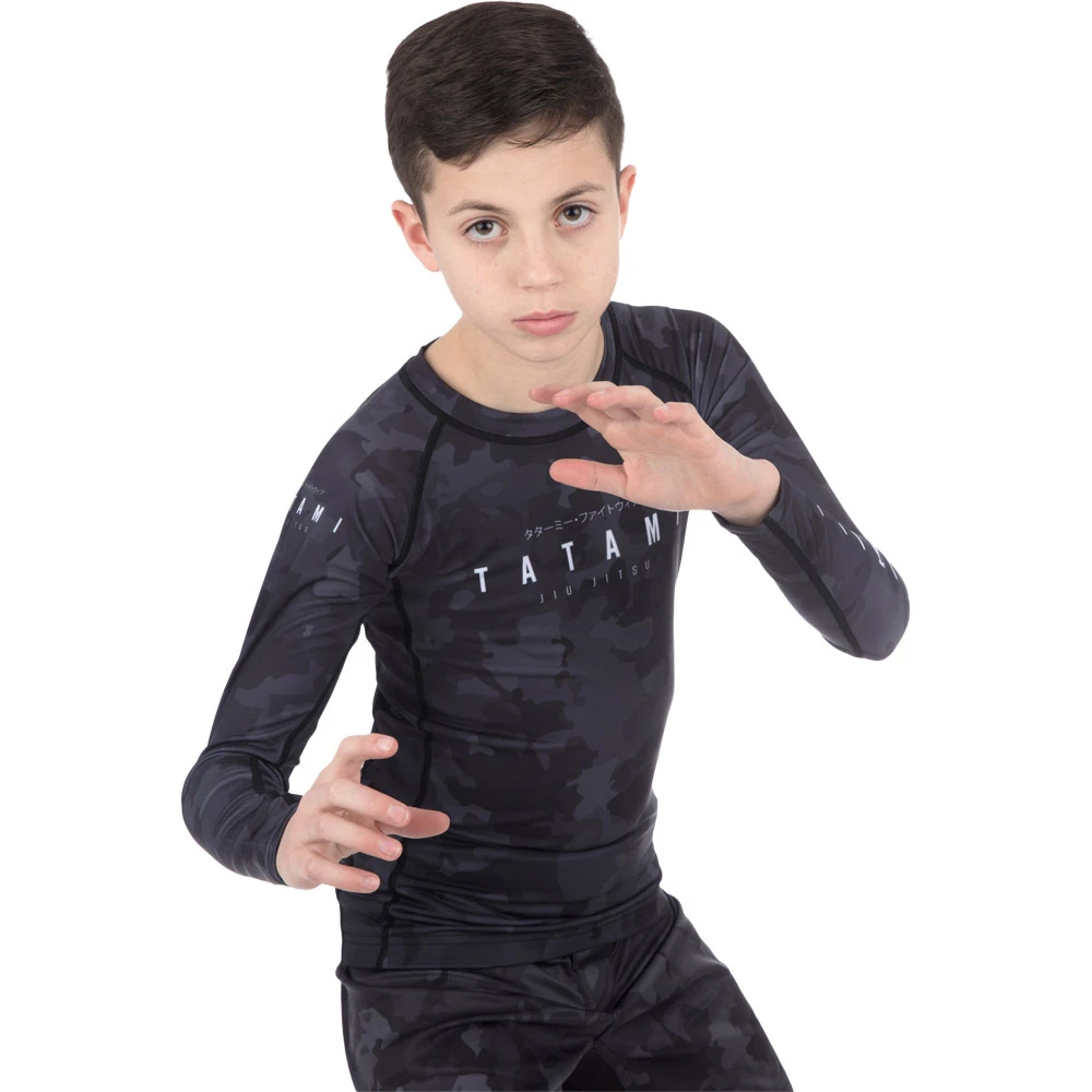 Available in long and short sleeve, the Stealth rash guard combines the patented dark camo with the Tatami print across the chest, neck and arm that’s sublimated to ensure long term durability. Made from an elastic fabric, this rash guard is made like Tatami’s usual high quality that creates a one-of-a-kind design without compromising any comfort or performance-boosting attributes that make it easy to wear and manoeuvre in.