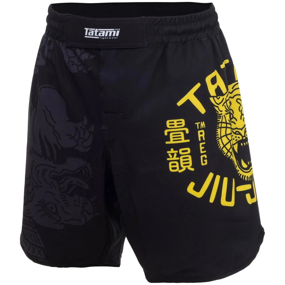 - Bold yellow Takedown Tiger design on the left leg of shorts